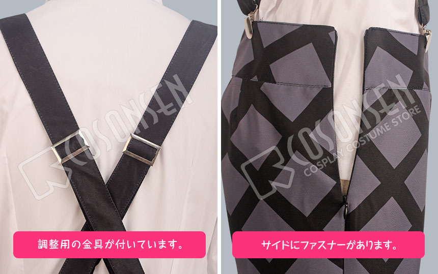 ポリ混紡で製作しました。チャック柄のデザインでよく原作の衣装を再現できます。脇にファスナーが付いてとても着脱しやすいです。