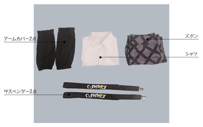 シャツ、ズボン、飾り物(アームカバー2点、サスペンダー2点)