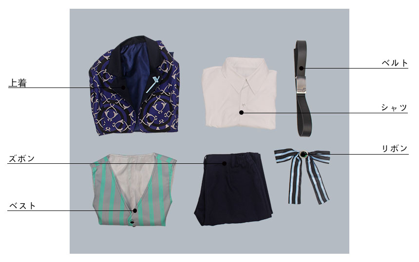 上着、ベスト、シャツ、ズボン、飾り物(リボン、ベルト)