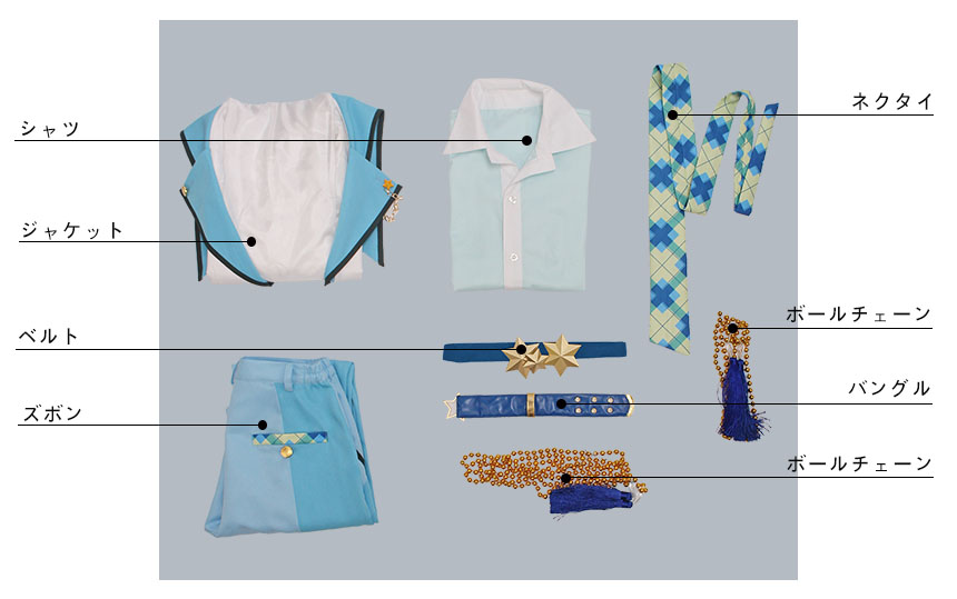 ジャケット、シャツ、ズボン、飾り物(ネクタイ、バングル、ベルト、ボールチェーン2点)