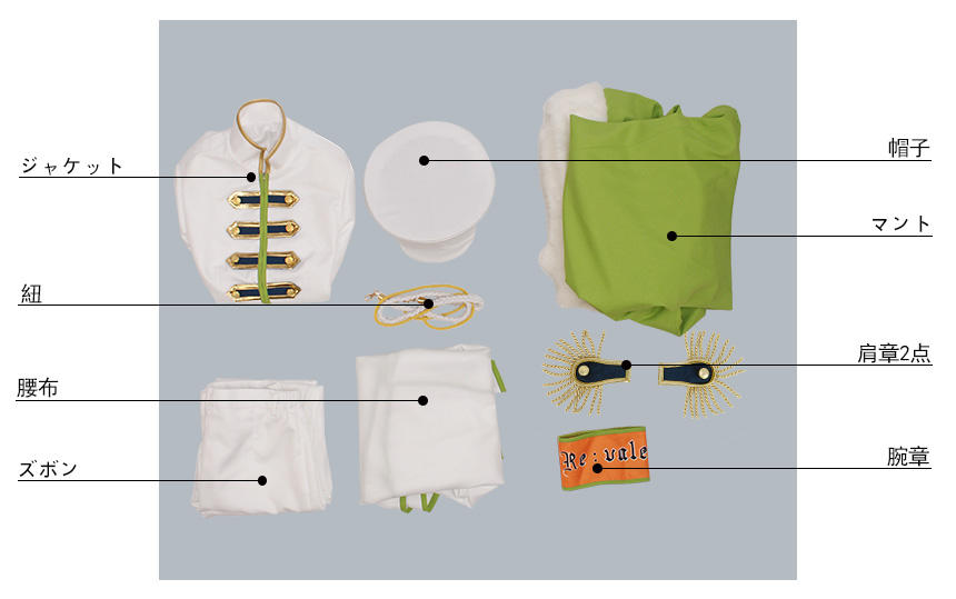 帽子、肩章2点、腕章、腰布、紐も付属しています。