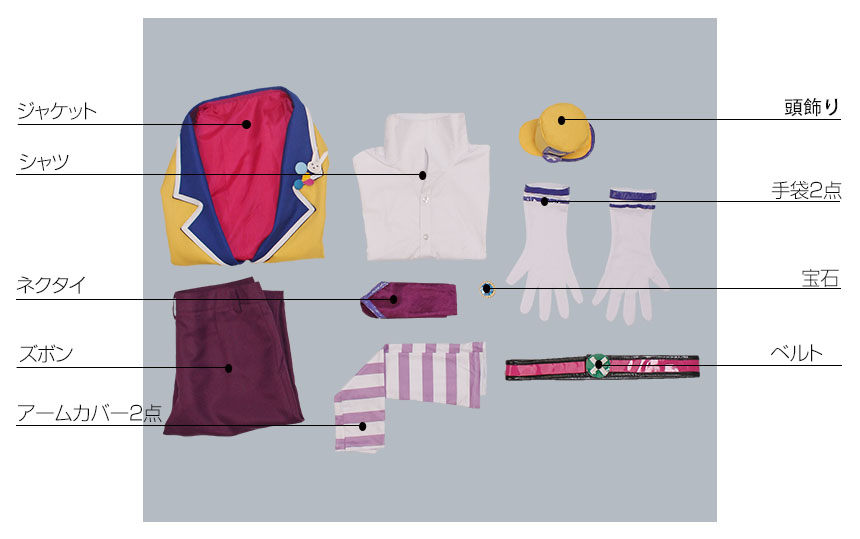 ジャケット、シャツ、ズボン、飾り物(頭飾り、ネクタイ、手袋2点、アームカバー2点、ベルト、宝石)