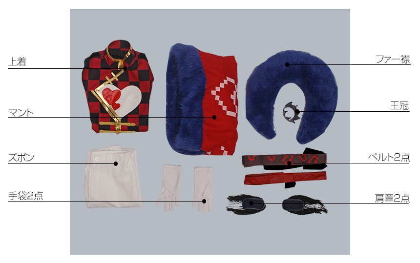 マント、上着、ズボン、飾り物(ファー襟、王冠、ベルト2点、肩章2点、手袋2点)