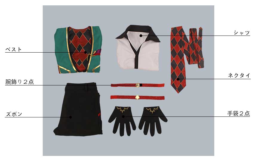 ベスト、シャツ、ズボン、飾り物(ネクタイ、腕飾り2点、手袋2点)