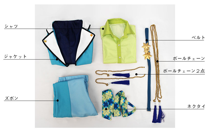 ジャケット、シャツ、ズボン、飾り物(ネクタイ、ベルト、ボールチェーン3点)