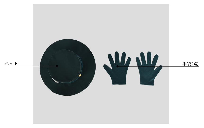 首飾り、ハット、手袋2点も付属しています。