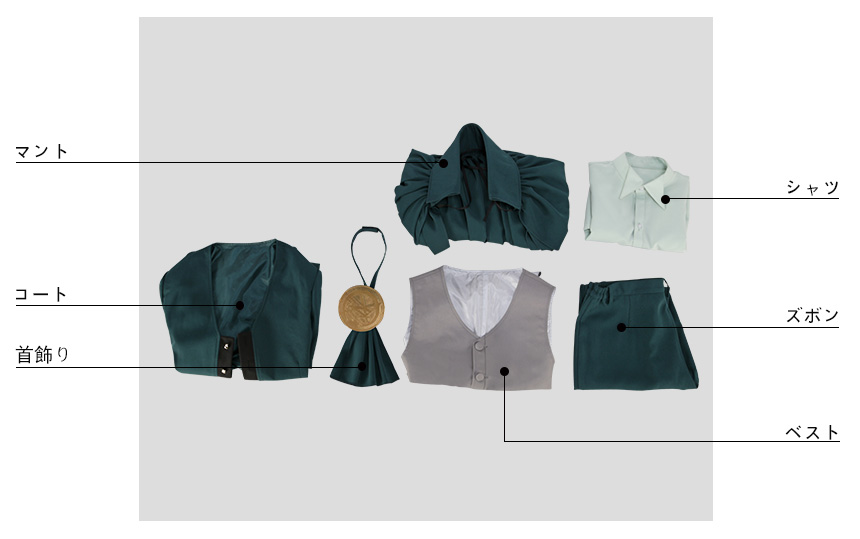 マント、コート、ベスト、シャツ、ズボン、飾り物(首飾り、ハット、手袋2点)
