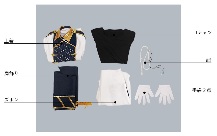 上着、Tシャツ、ズボン、飾り物(肩飾り、紐、手袋2点)