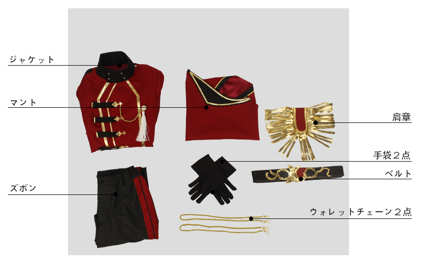 ジャケット、ズボン、飾り物(マント、肩章、ベルト、ウォーレットチェーン2点、手袋2点)