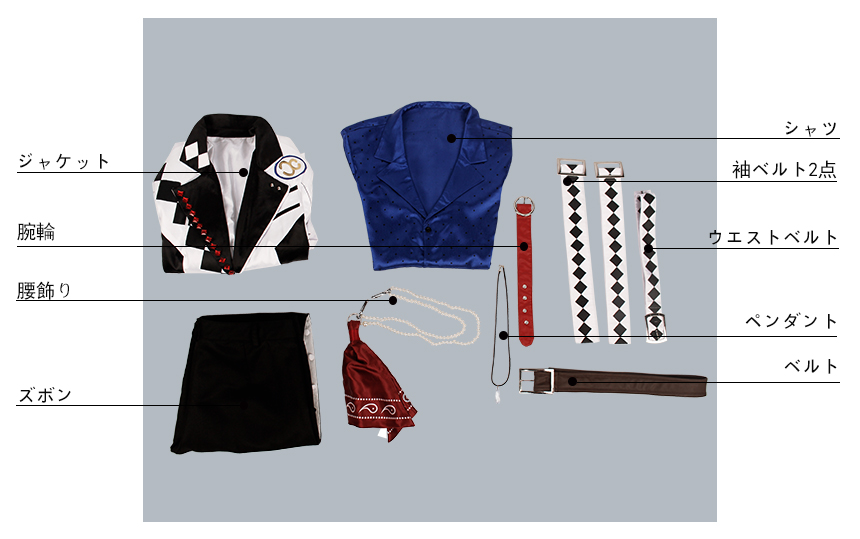 ジャケット、シャツ、ズボン、飾り物(ペンダント、腕輪、ベルト、腰飾り、ウエストベルト、袖ベルト2点)