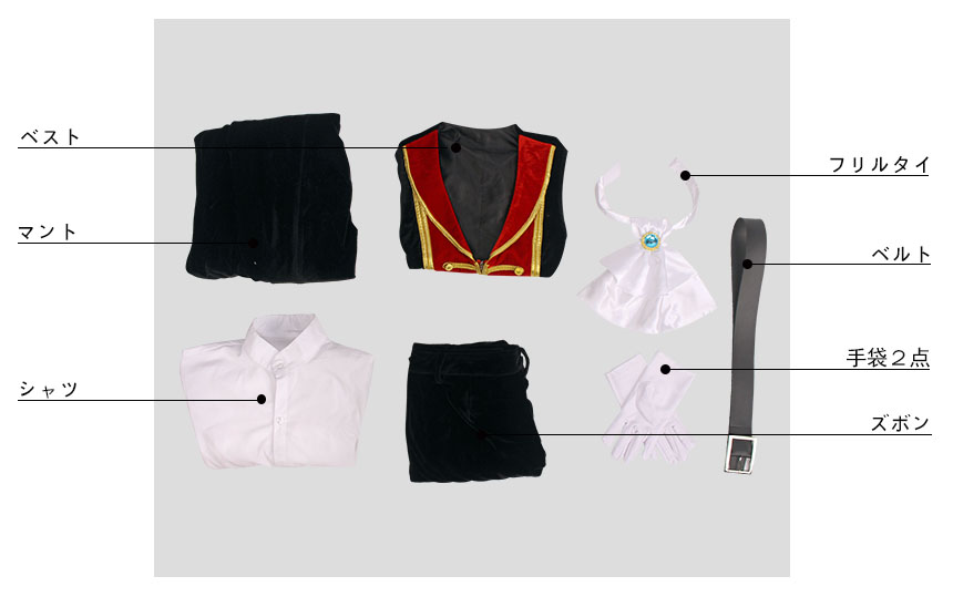 マント、ベスト、シャツ、ズボン、飾り物(フリルタイ、ベルト、手袋2点)