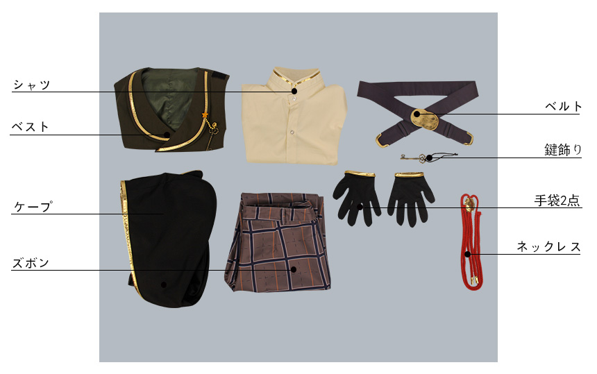 ベスト、シャツ、ズボン、飾り物(ケープ、ネックレス、ベルト、鍵飾り、手袋2点)