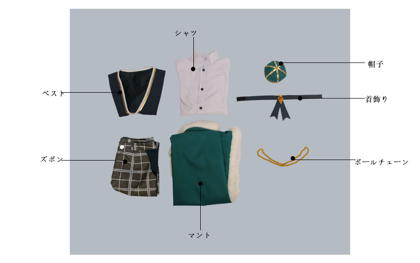 マント、ベスト、シャツ、ズボン、飾り物(帽子、首飾り、ボールチェーン)