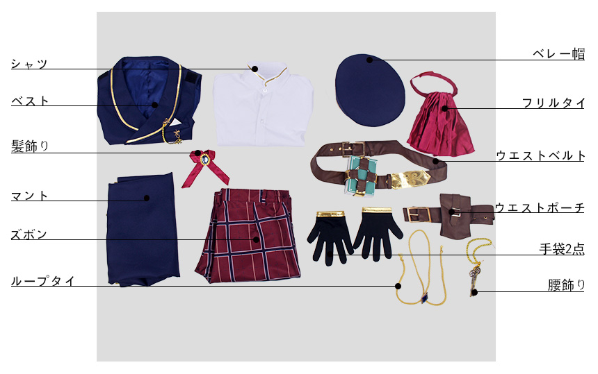 マント、ベスト、シャツ、ズボン、飾り物(ベレー帽、髪飾り、ループタイ、フリルタイ、ウエストベルト、ウエストポーチ、腰飾り、手袋2点)