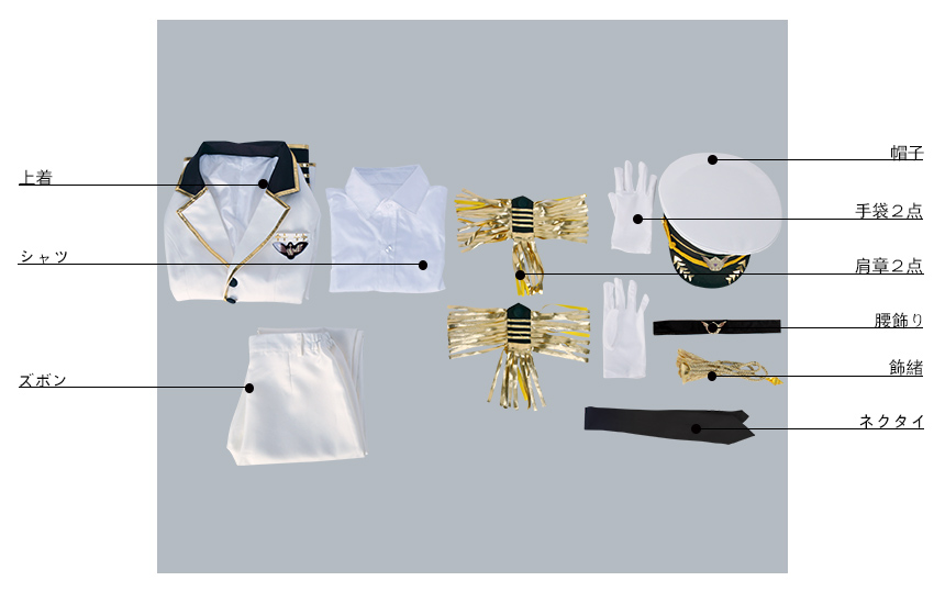 帽子、肩章2点、ネクタイ、飾緒、腰飾り、手袋2点も付属しています。