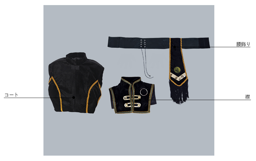 コート、上着、ベスト、インナー、ズボン、飾り物(紐飾り、襟、腰飾り、アーム飾り、ベルト、手袋2点)