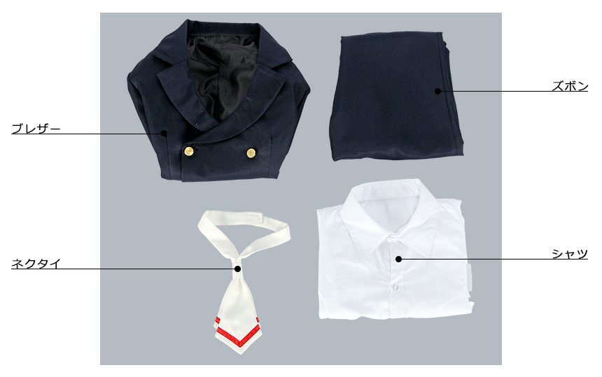 ブレザー、シャツ、ズボン、飾り物(ネクタイ)