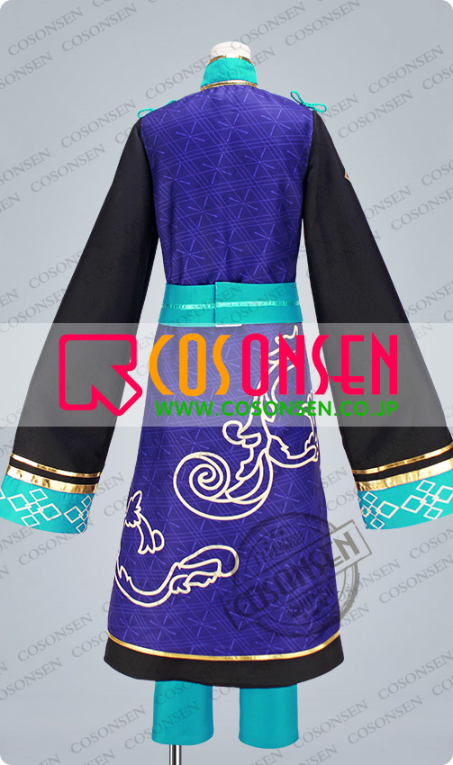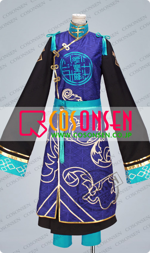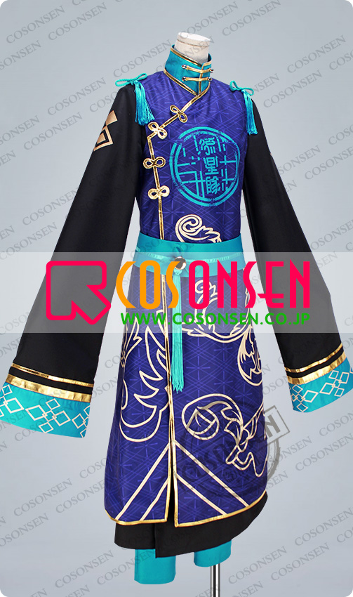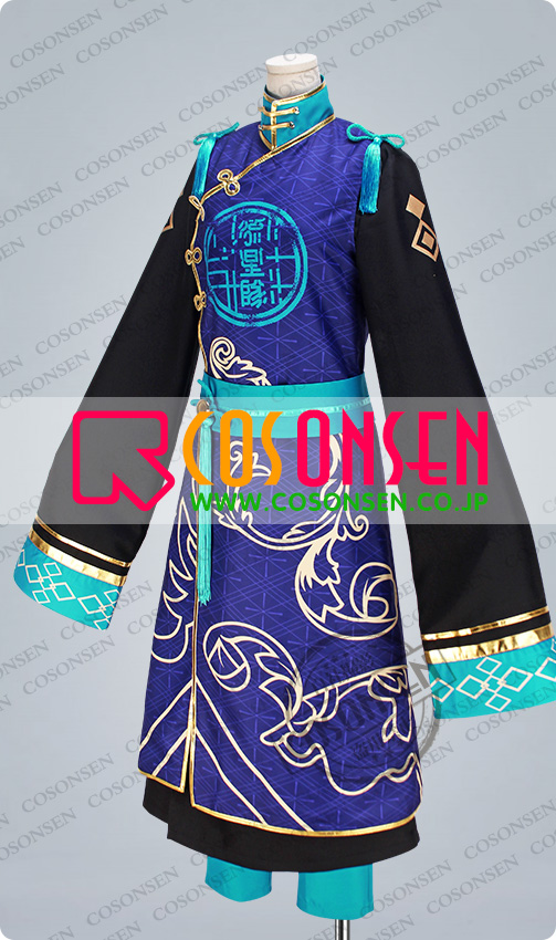 ポリ混紡で製作しました。ブルーを基調として美しい絵柄が施された生地で製作された上着です。全身に金色の合皮生地で縁取りをして、綺麗な絵柄がプリントされています。胸に「流星隊」が施されています。マジックテープで着脱します。細部までこだわり、チャイナ風のデザインに仕上がっています。