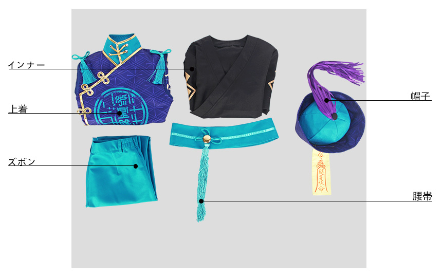 上着、インナー、ズボン、飾り物(帽子、腰帯)