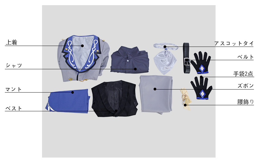 マント、上着、ベスト、シャツ、ズボン、飾り物(手袋2点、ベルト、アスコットタイ、腰飾り)