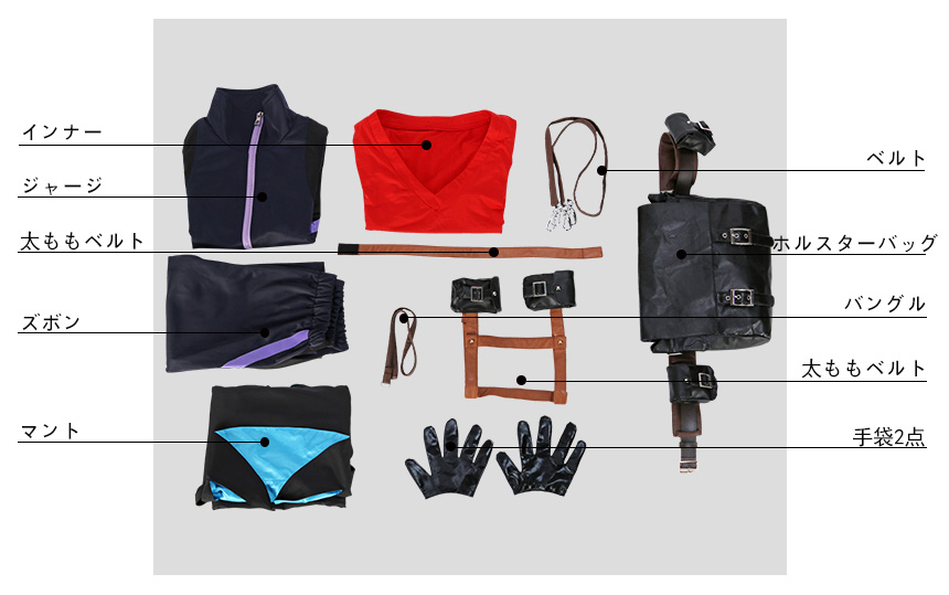 ジャージ、インナー、ズボン、飾り物(マント、ベルト、ホルスターバッグ、バングル、手袋2点、太ももベルト2点)