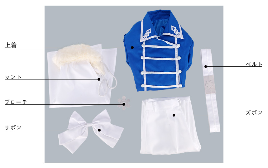 マント、上着、ズボン、飾り物(ベルト、リボン、ブローチ)