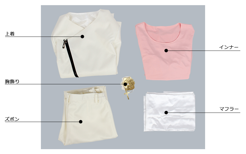 上着、インナー、ズボン、飾り物(マフラー、胸飾り)