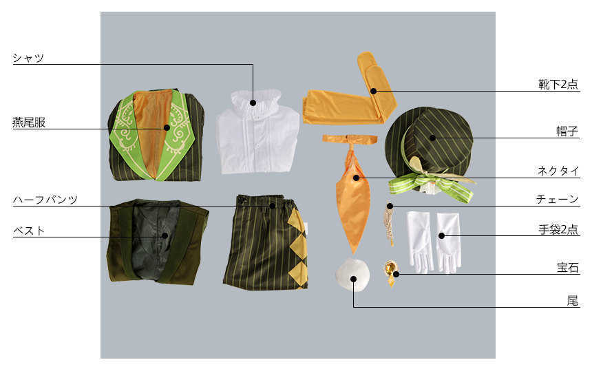 燕尾服、ベスト、シャツ、ハーフパンツ、飾り物(帽子、ネクタイ、宝石、チェーン、手袋2点、尾、靴下2点)