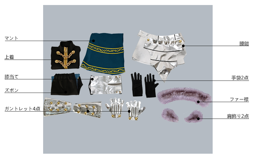 ファー襟、肩飾り2点、手袋2点、ガントレット4点、腰鎧、膝当ても付属しています。