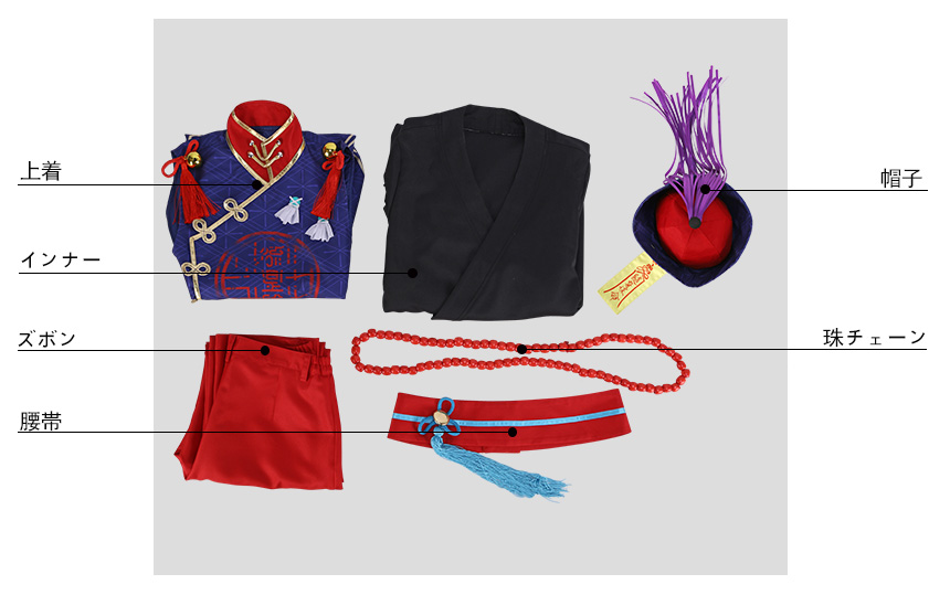 上着、インナー、ズボン、飾り物(帽子、腰帯、珠チェーン)
