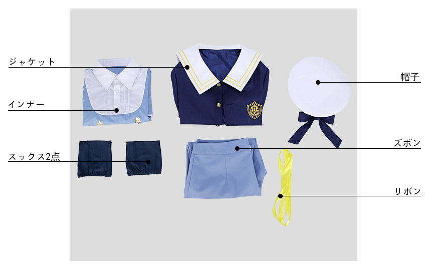 ジャケット、インナー、ズボン、飾り物(帽子、リボン、スックス2点)