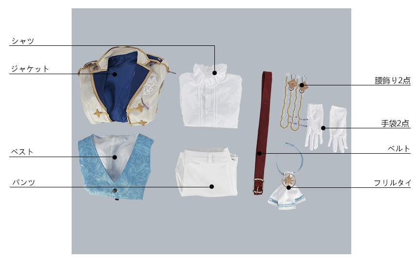 ジャケット、ベスト、シャツ、パンツ、飾り物(フリルタイ、腰飾り2点、ベルト、手袋2点)