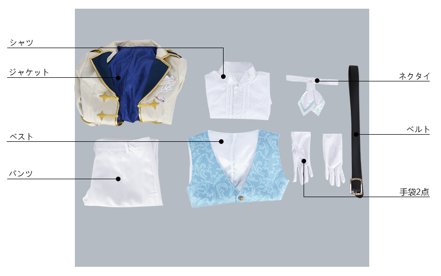 ジャケット、ベスト、シャツ、パンツ、飾り物(ネクタイ、ベルト、手袋2点)
