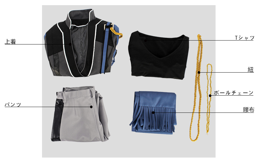 上着、Tシャツ、パンツ、飾り物(紐2点、腰布)