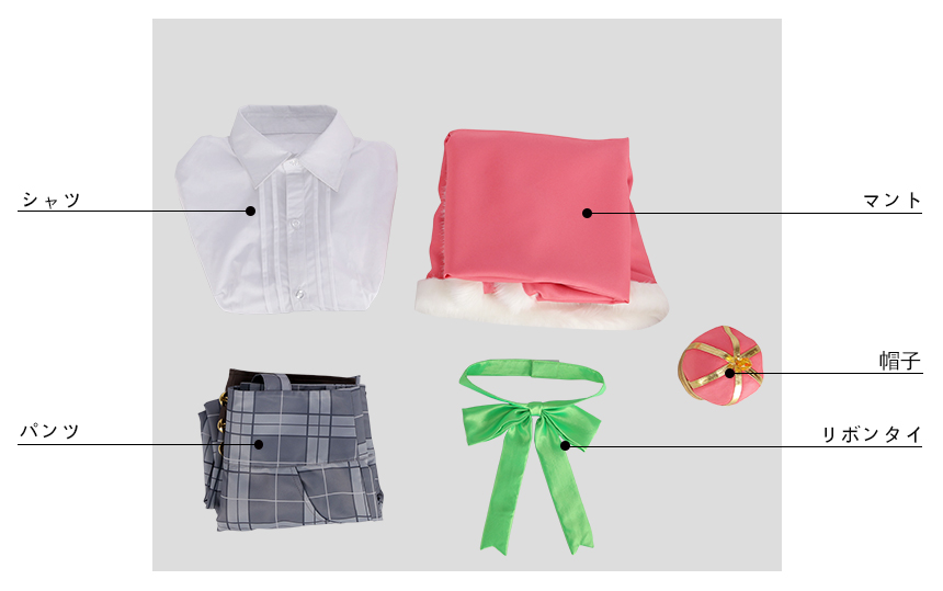 マント、シャツ、パンツ、飾り物(帽子、リボンタイ)