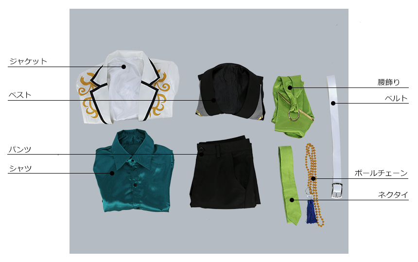 ジャケット、ベスト、シャツ、パンツ、飾り物(ネクタイ、ベルト、ボールチェーン、腰飾り)
