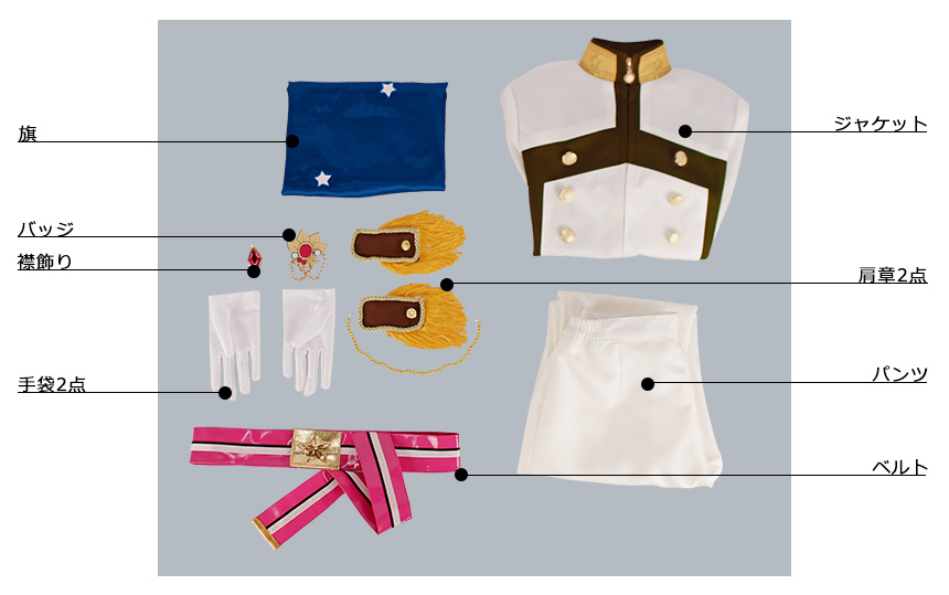 肩章2点、襟飾り、バッジ、ベルト、手袋2点、旗も付属しています。