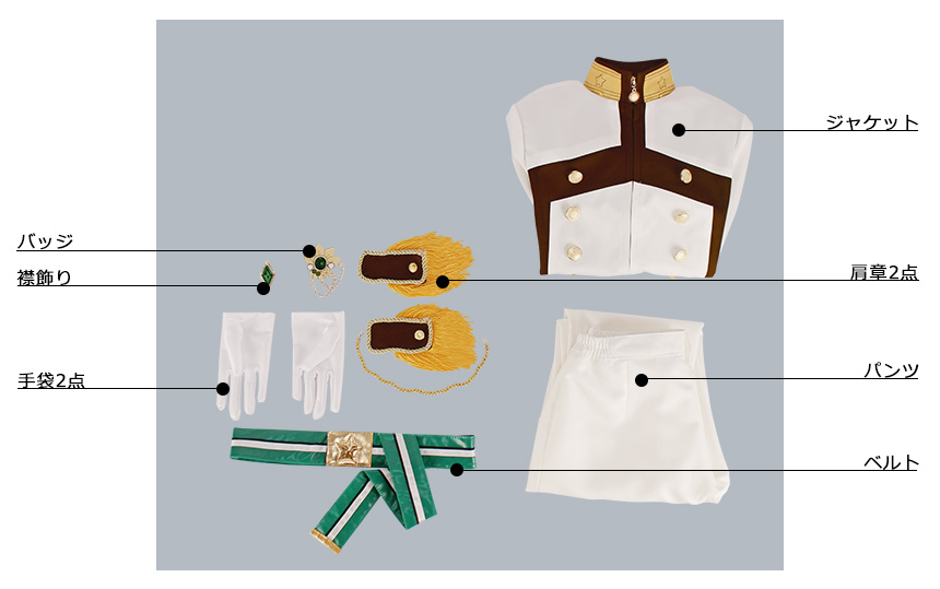 肩章2点、襟飾り、バッジ、ベルト、手袋2点も付属しています。