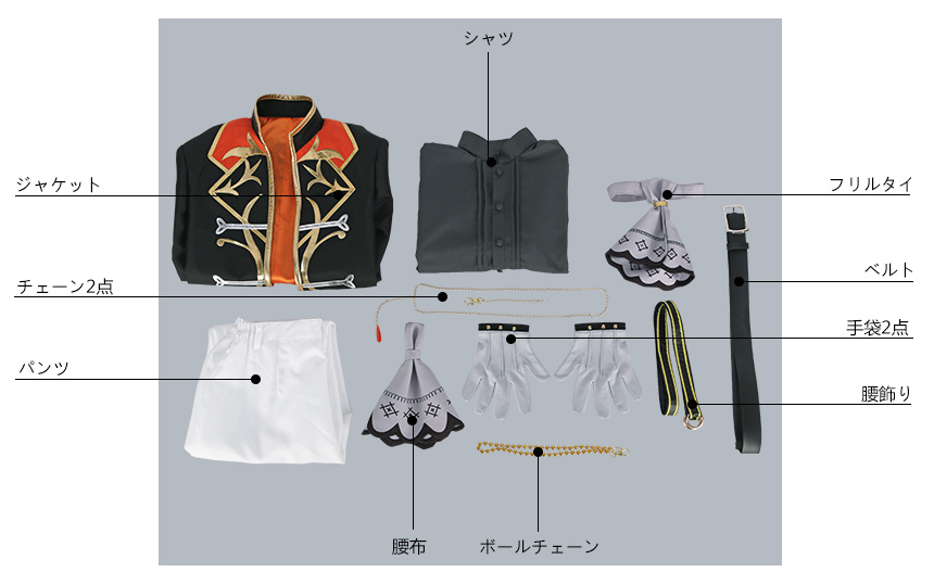 ジャケット、シャツ、パンツ、飾り物(フリルタイ、ベルト、チェーン2点、ボールチェーン、腰布、腰飾り、手袋2点)