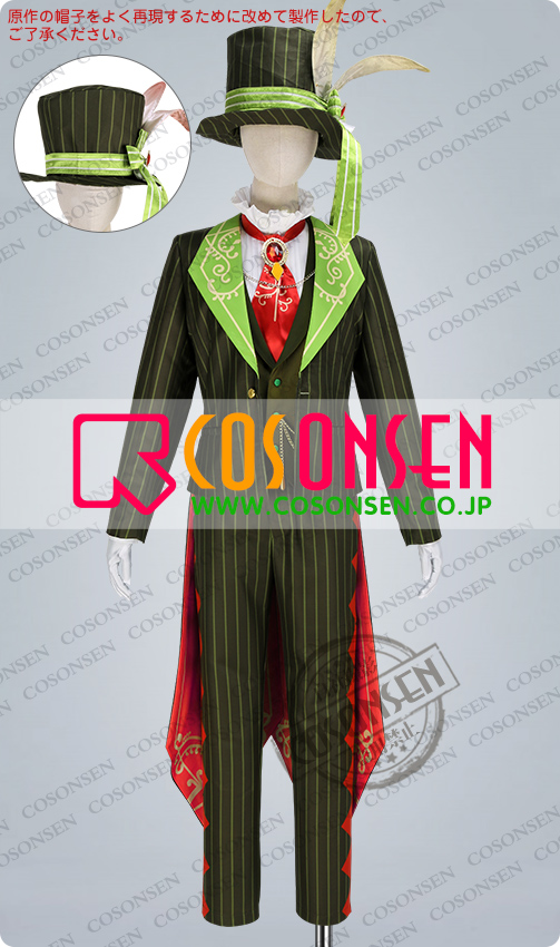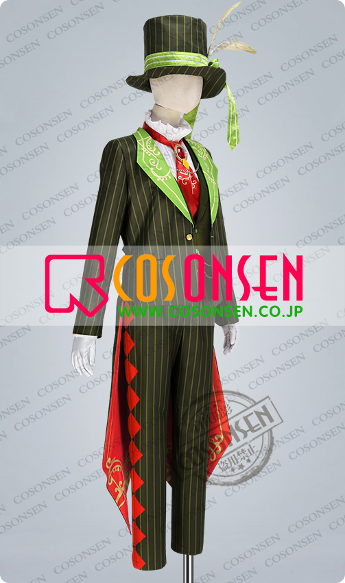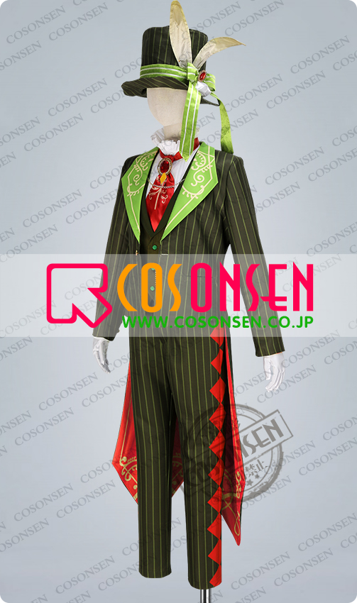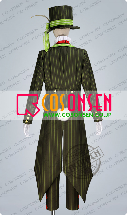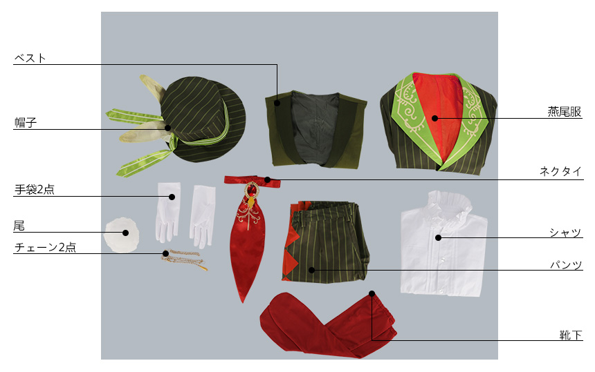 燕尾服、ベスト、シャツ、パンツ、飾り物(帽子、ネクタイ、チェーン2点、手袋2点、尾、靴下2点)
