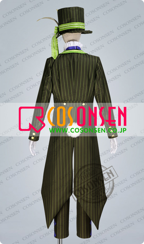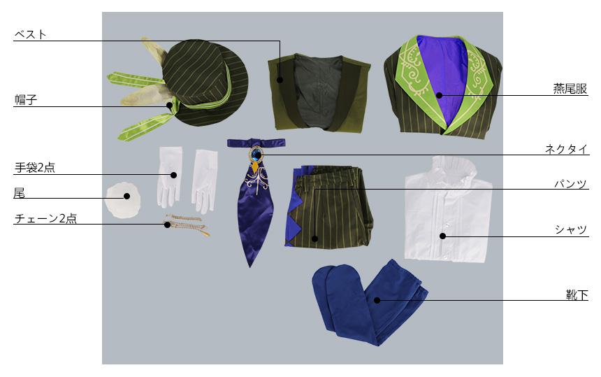 燕尾服、ベスト、シャツ、パンツ、飾り物(帽子、ネクタイ、チェーン2点、手袋2点、尾、ソックス2点)