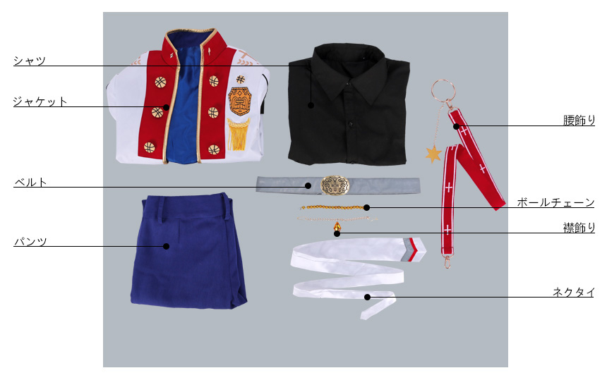 ジャケット、シャツ、パンツ、飾り物(ネクタイ、襟飾り、ボールチェーン、ベルト、腰飾り)