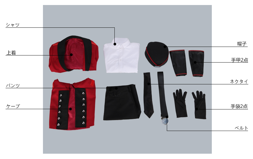 ケープ、上着、シャツ、パンツ、飾り物(帽子、ネクタイ、飾り紐、髪飾り2点、肩鎧2点、ベルト、帯、手袋2点、手甲2点、篭手2点、脛当2点)