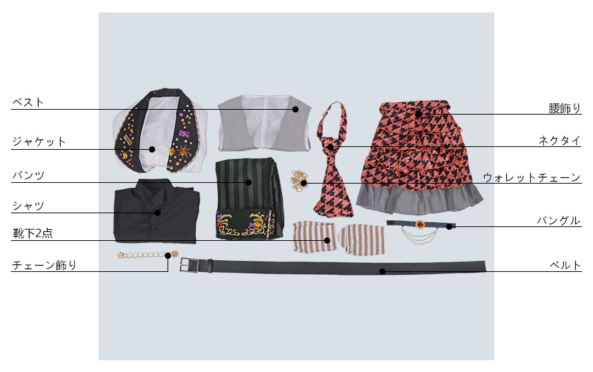 ジャケット、ベスト、シャツ、パンツ、飾り物(ネクタイ、チェーン飾り、ベルト、ウォレットチェーン、腰飾り、バングル、靴下2点)