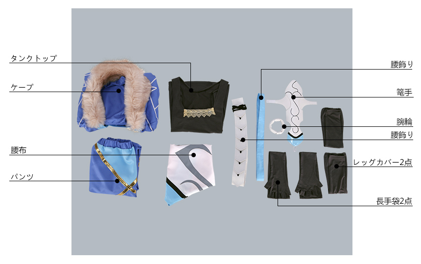 腰飾り2点、腰布、腕輪、篭手、レッグカバー2点、長手袋2点も付属しています。