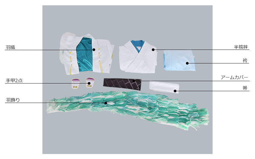 アームカバー、帯、手甲2点、羽飾りも付属しています。