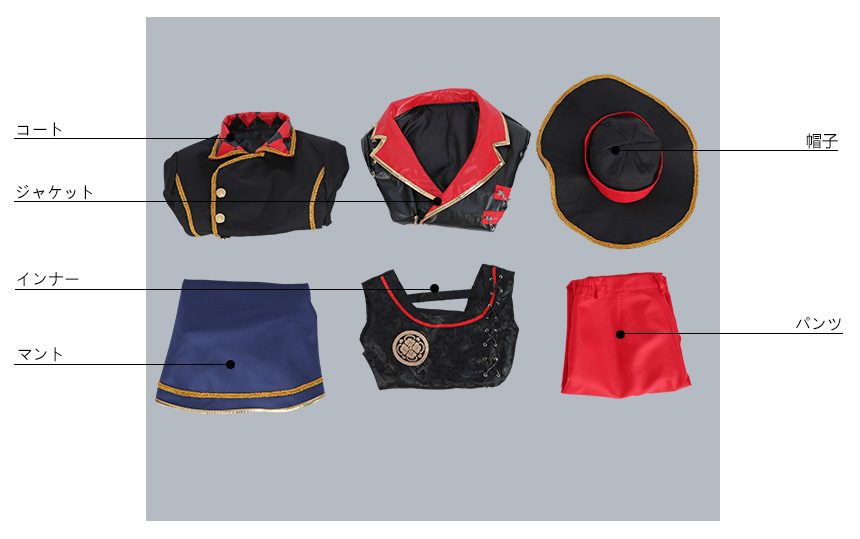 マント、コート、ジャケット、インナー、パンツ、飾り物(帽子、肩章、腰飾り、肩飾り、手袋2点、腕輪、ベルト4点)