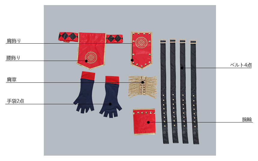 帽子、肩章、腰飾り、肩飾り、手袋2点、腕輪、ベルト4点も付属しています。