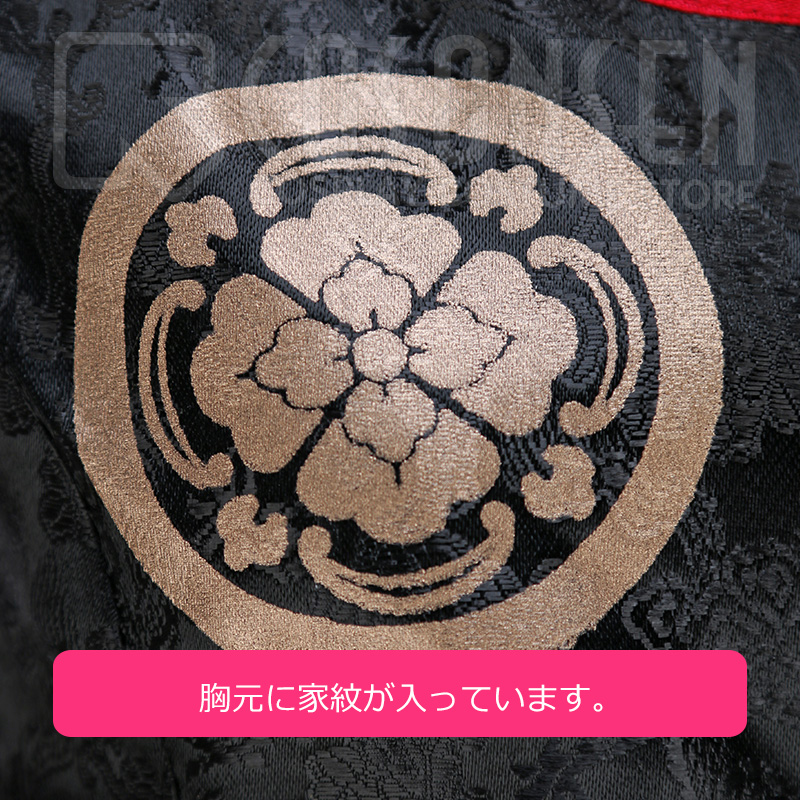 合皮で製作しました。ファスナーで着脱します。肩と腰の部分ににピラミッドスタッズを付けています。家紋の入った肩飾りが付いています。