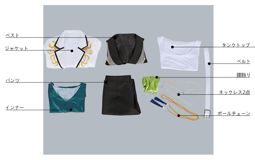 ジャケット、ベスト、インナー、タンクトップ、パンツ、飾り物(ネックレス2点、ベルト、ボールチェーン、腰飾り)